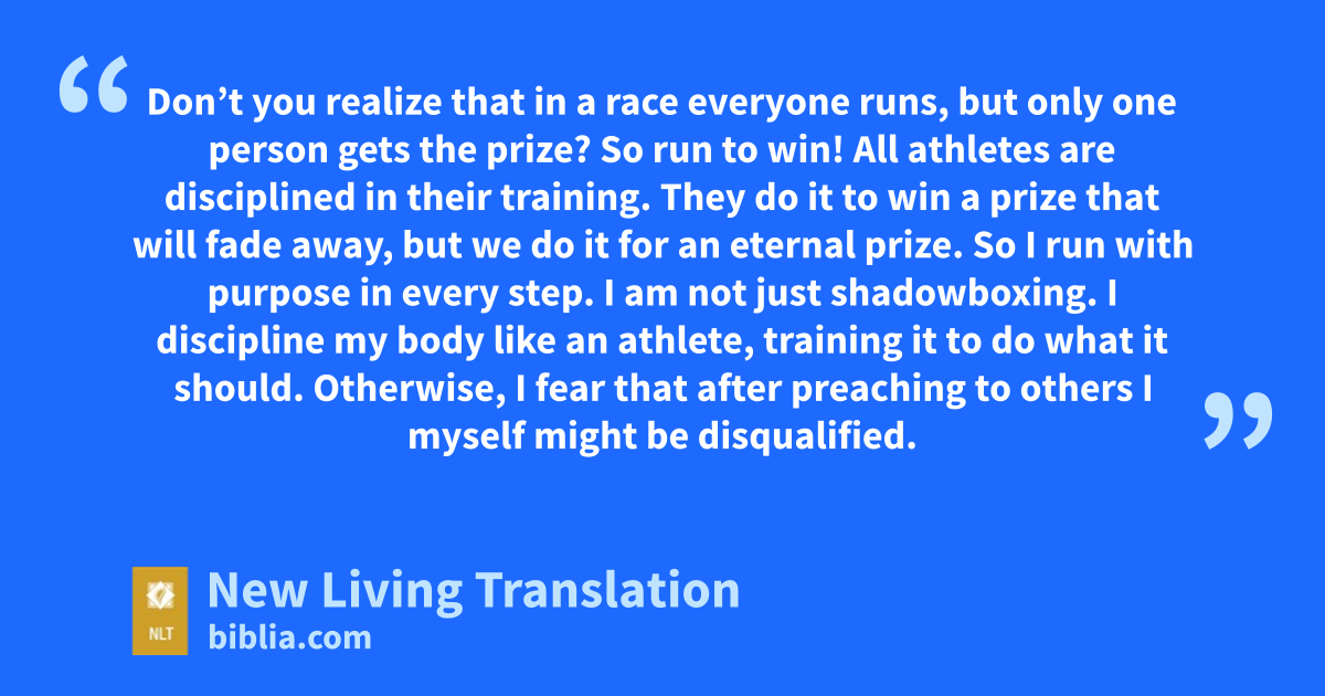 24 Don’t you realize that in a race everyone runs, but only one person gets the prize? So run to win! 25 All athletes are disciplined in their training. They do it to win a prize that will fade away, but we do it for an eternal prize. 26 So I run with purpose in every step. I am not just shadowboxing. 27 I discipline my body like an athlete, training it to do what it should. Otherwise, I fear that after preaching to others I myself might be disqualified.