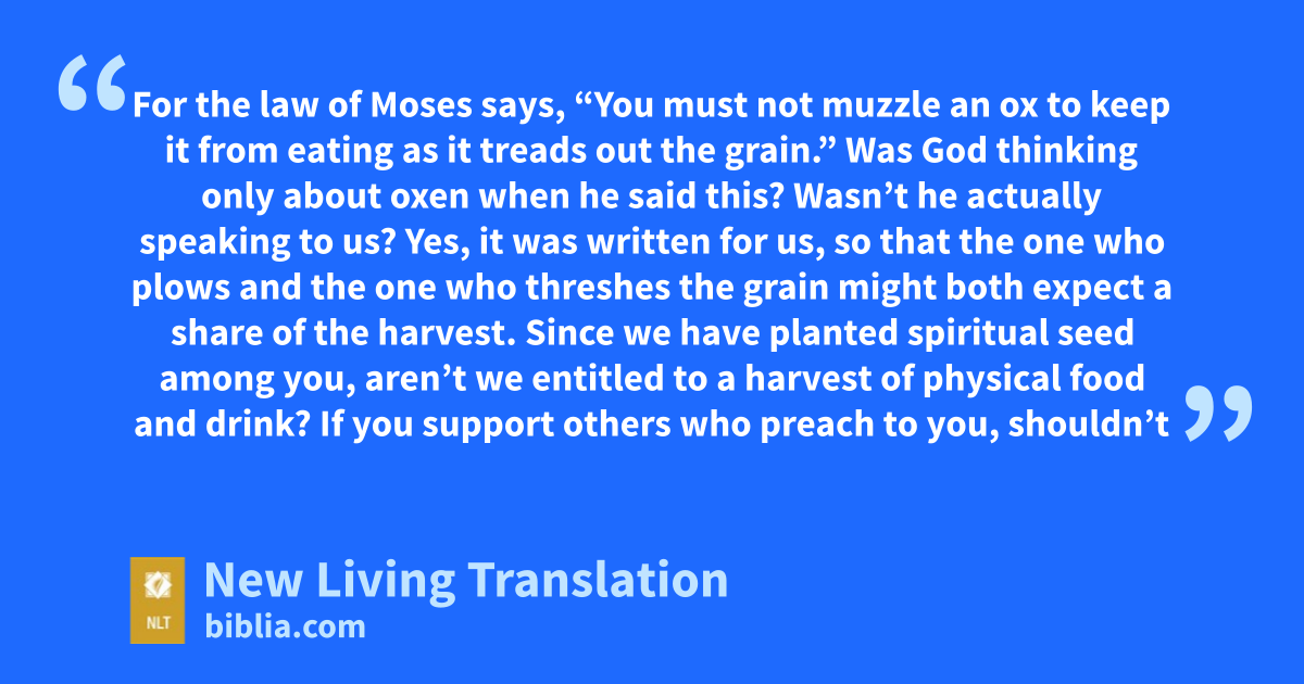 7 What soldier has to pay his own expenses? What farmer plants a vineyard and doesn’t have the right to eat some of its fruit? What shepherd cares for a flock of sheep and isn’t allowed to drink some of the milk? 8 Am I expressing merely a human opinion, or does the law say the same thing? 9 For the law of Moses says, “You must not muzzle an ox to keep it from eating as it treads out the grain.”* Was God thinking only about oxen when he said this? 10 Wasn’t he actually speaking to us? Yes, it was written for us, so that the one who plows and the one who threshes the grain might both expect a share of the harvest.