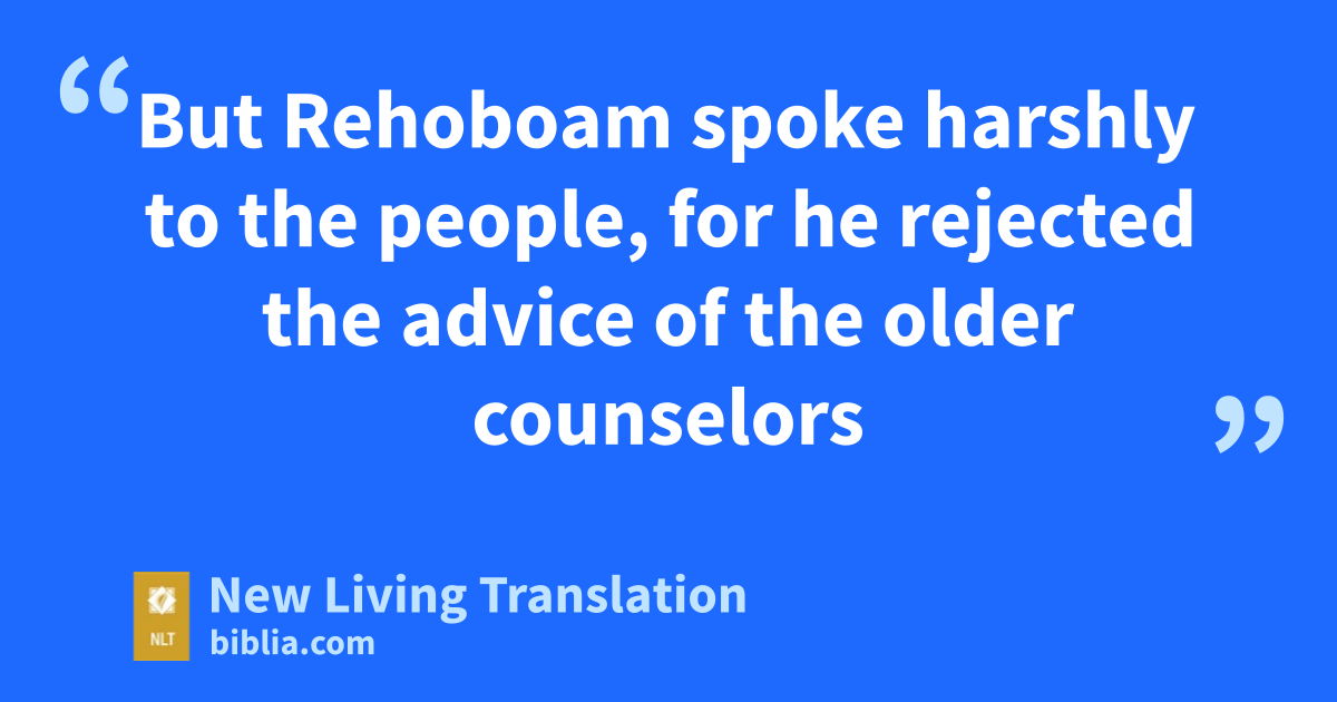 12 Three days later Jeroboam and all the people returned to hear Rehoboam’s decision, just as the king had ordered. 13 But Rehoboam spoke harshly to the people, for he rejected the advice of the older counselors 14 and followed the counsel of his younger advisers. He told the people, “My father laid heavy burdens on you, but I’m going to make them even heavier! My father beat you with whips, but I will beat you with scorpions!”