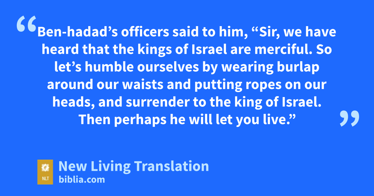 31 Ben-hadad’s officers said to him, “Sir, we have heard that the kings of Israel are merciful. So let’s humble ourselves by wearing burlap around our waists and putting ropes on our heads, and surrender to the king of Israel. Then perhaps he will let you live.”
