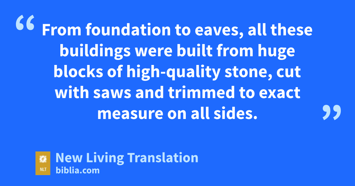 9 From foundation to eaves, all these buildings were built from huge blocks of high-quality stone, cut with saws and trimmed to exact measure on all sides. 10 Some of the huge foundation stones were 15 feet long, and some were 12 feet* long. 11 The blocks of high-quality stone used in the walls were also cut to measure, and cedar beams were also used. 12 The walls of the great courtyard were built so that there was one layer of cedar beams between every three layers of finished stone, just like the walls of the inner courtyard of the Lord’s Temple with its entry room.