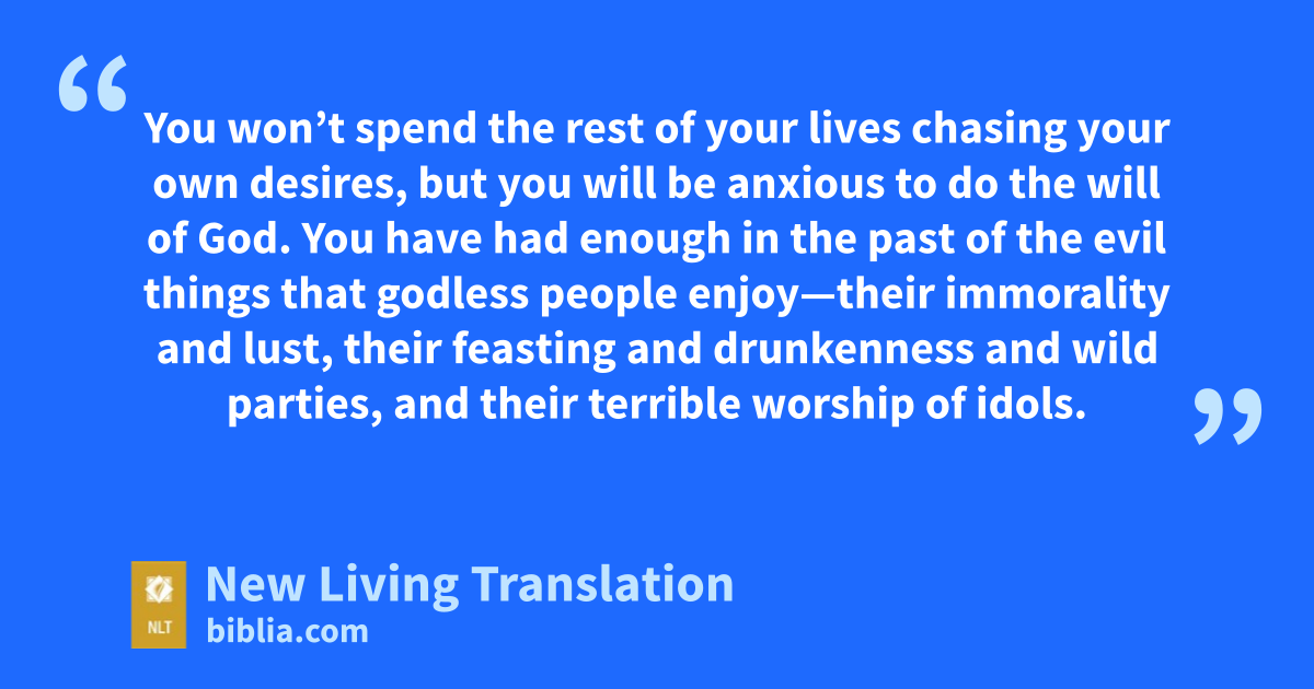 So then, since Christ suffered physical pain, you must arm yourselves with the same attitude he had, and be ready to suffer, too. For if you have suffered physically for Christ, you have finished with sin.* 2 You won’t spend the rest of your lives chasing your own desires, but you will be anxious to do the will of God. 3 You have had enough in the past of the evil things that godless people enjoy—their immorality and lust, their feasting and drunkenness and wild parties, and their terrible worship of idols.