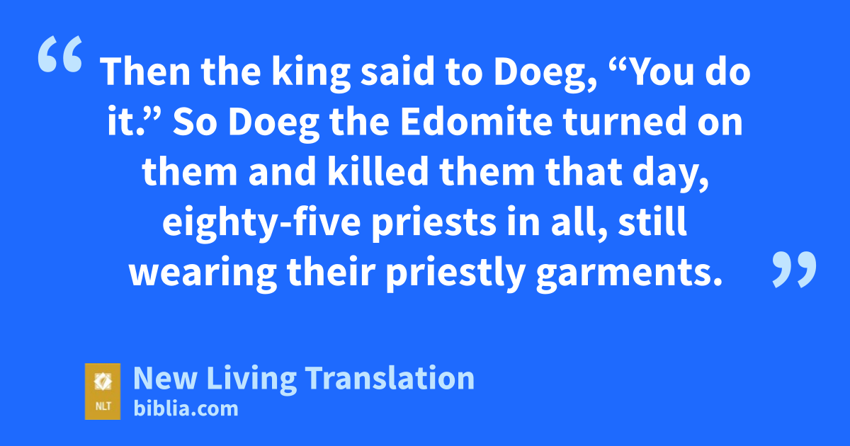 18 Then the king said to Doeg, “You do it.” So Doeg the Edomite turned on them and killed them that day, eighty-five priests in all, still wearing their priestly garments. 19 Then he went to Nob, the town of the priests, and killed the priests’ families—men and women, children and babies—and all the cattle, donkeys, sheep, and goats.