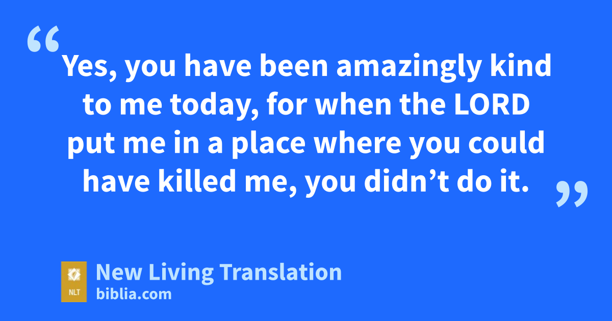 9 Then he shouted to Saul, “Why do you listen to the people who say I am trying to harm you? 10 This very day you can see with your own eyes it isn’t true. For the Lord placed you at my mercy back there in the cave. Some of my men told me to kill you, but I spared you. For I said, ‘I will never harm the king—he is the Lord’s anointed one.’ 11 Look, my father, at what I have in my hand. It is a piece of the hem of your robe! I cut it off, but I didn’t kill you. This proves that I am not trying to harm you and that I have not sinned against you, even though you have been hunting for me to kill me.