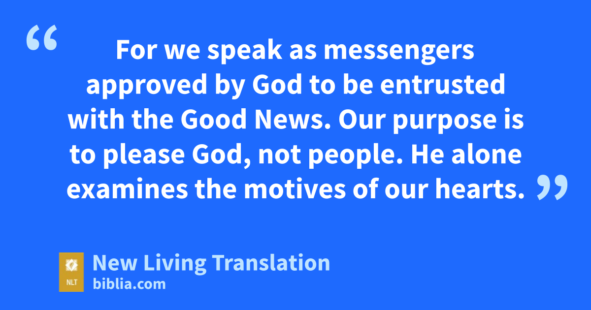4 For we speak as messengers approved by God to be entrusted with the Good News. Our purpose is to please God, not people. He alone examines the motives of our hearts. 5 Never once did we try to win you with flattery, as you well know. And God is our witness that we were not pretending to be your friends just to get your money! 6 As for human praise, we have never sought it from you or anyone else.