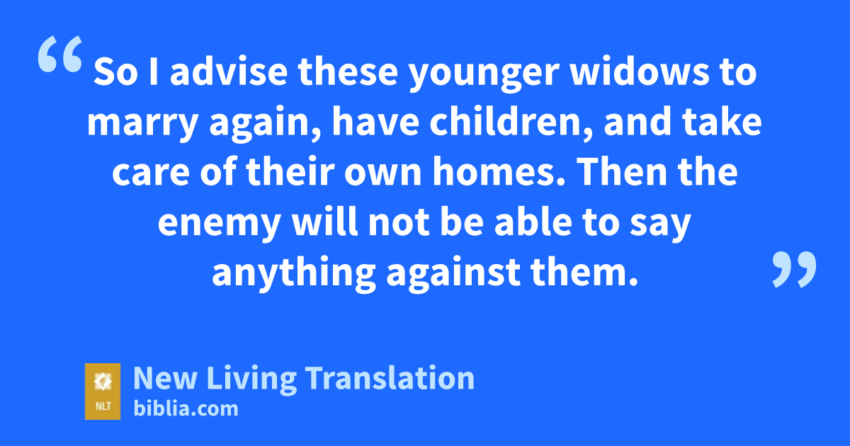 11 The younger widows should not be on the list, because their physical desires will overpower their devotion to Christ and they will want to remarry. 12 Then they would be guilty of breaking their previous pledge. 13 And if they are on the list, they will learn to be lazy and will spend their time gossiping from house to house, meddling in other people’s business and talking about things they shouldn’t. 14 So I advise these younger widows to marry again, have children, and take care of their own homes. Then the enemy will not be able to say anything against them. 15 For I am afraid that some of them have already gone astray and now follow Satan.