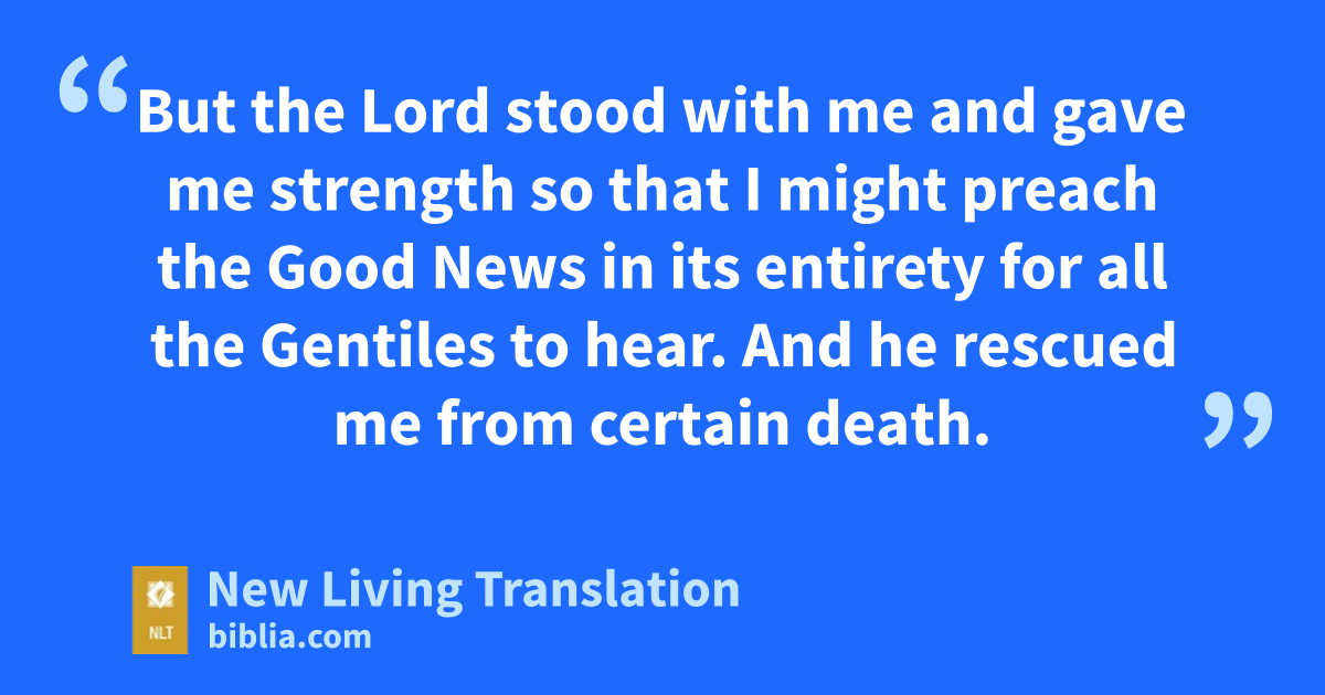 16 The first time I was brought before the judge, no one came with me. Everyone abandoned me. May it not be counted against them. 17 But the Lord stood with me and gave me strength so that I might preach the Good News in its entirety for all the Gentiles to hear. And he rescued me from certain death.* 18 Yes, and the Lord will deliver me from every evil attack and will bring me safely into his heavenly Kingdom. All glory to God forever and ever! Amen.