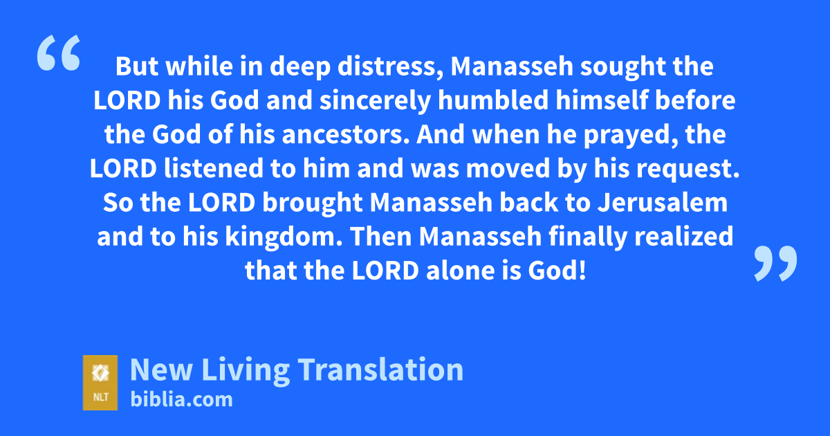 10 The Lord spoke to Manasseh and his people, but they ignored all his warnings. 11 So the Lord sent the commanders of the Assyrian armies, and they took Manasseh prisoner. They put a ring through his nose, bound him in bronze chains, and led him away to Babylon. 12 But while in deep distress, Manasseh sought the Lord his God and sincerely humbled himself before the God of his ancestors. 13 And when he prayed, the Lord listened to him and was moved by his request. So the Lord brought Manasseh back to Jerusalem and to his kingdom. Then Manasseh finally realized that the Lord alone is God!
