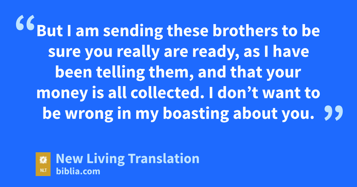 3 But I am sending these brothers to be sure you really are ready, as I have been telling them, and that your money is all collected. I don’t want to be wrong in my boasting about you. 4 We would be embarrassed—not to mention your own embarrassment—if some Macedonian believers came with me and found that you weren’t ready after all I had told them! 5 So I thought I should send these brothers ahead of me to make sure the gift you promised is ready. But I want it to be a willing gift, not one given grudgingly.