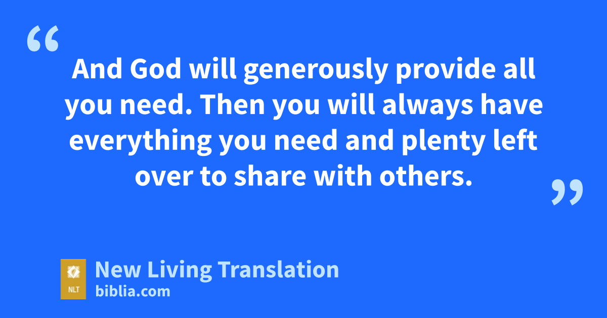 6 Remember this—a farmer who plants only a few seeds will get a small crop. But the one who plants generously will get a generous crop. 7 You must each decide in your heart how much to give. And don’t give reluctantly or in response to pressure. “For God loves a person who gives cheerfully.”* 8 And God will generously provide all you need. Then you will always have everything you need and plenty left over to share with others. 9 As the Scriptures say,