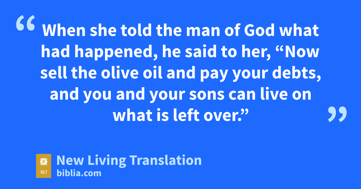 7 When she told the man of God what had happened, he said to her, “Now sell the olive oil and pay your debts, and you and your sons can live on what is left over.”