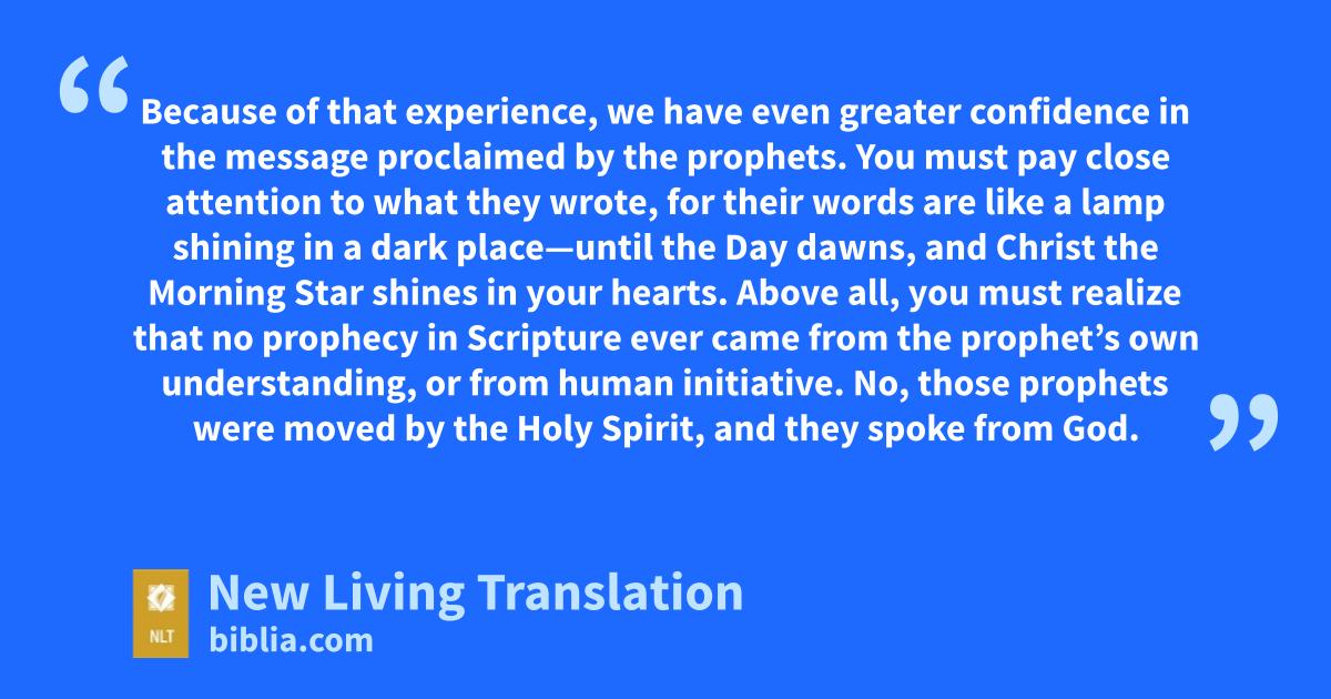 19 Because of that experience, we have even greater confidence in the message proclaimed by the prophets. You must pay close attention to what they wrote, for their words are like a lamp shining in a dark place—until the Day dawns, and Christ the Morning Star shines* in your hearts. 20 Above all, you must realize that no prophecy in Scripture ever came from the prophet’s own understanding,* 21 or from human initiative. No, those prophets were moved by the Holy Spirit, and they spoke from God.