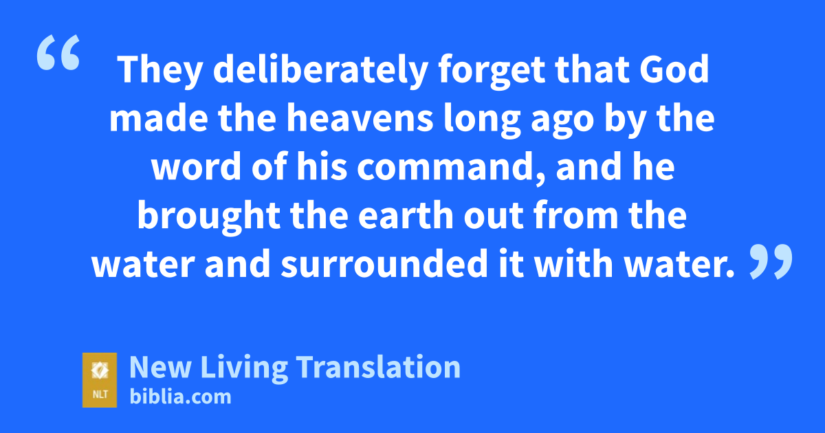 5 They deliberately forget that God made the heavens long ago by the word of his command, and he brought the earth out from the water and surrounded it with water. 6 Then he used the water to destroy the ancient world with a mighty flood. 7 And by the same word, the present heavens and earth have been stored up for fire. They are being kept for the day of judgment, when ungodly people will be destroyed.