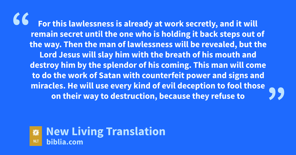 5 Don’t you remember that I told you about all this when I was with you? 6 And you know what is holding him back, for he can be revealed only when his time comes. 7 For this lawlessness is already at work secretly, and it will remain secret until the one who is holding it back steps out of the way. 8 Then the man of lawlessness will be revealed, but the Lord Jesus will slay him with the breath of his mouth and destroy him by the splendor of his coming.