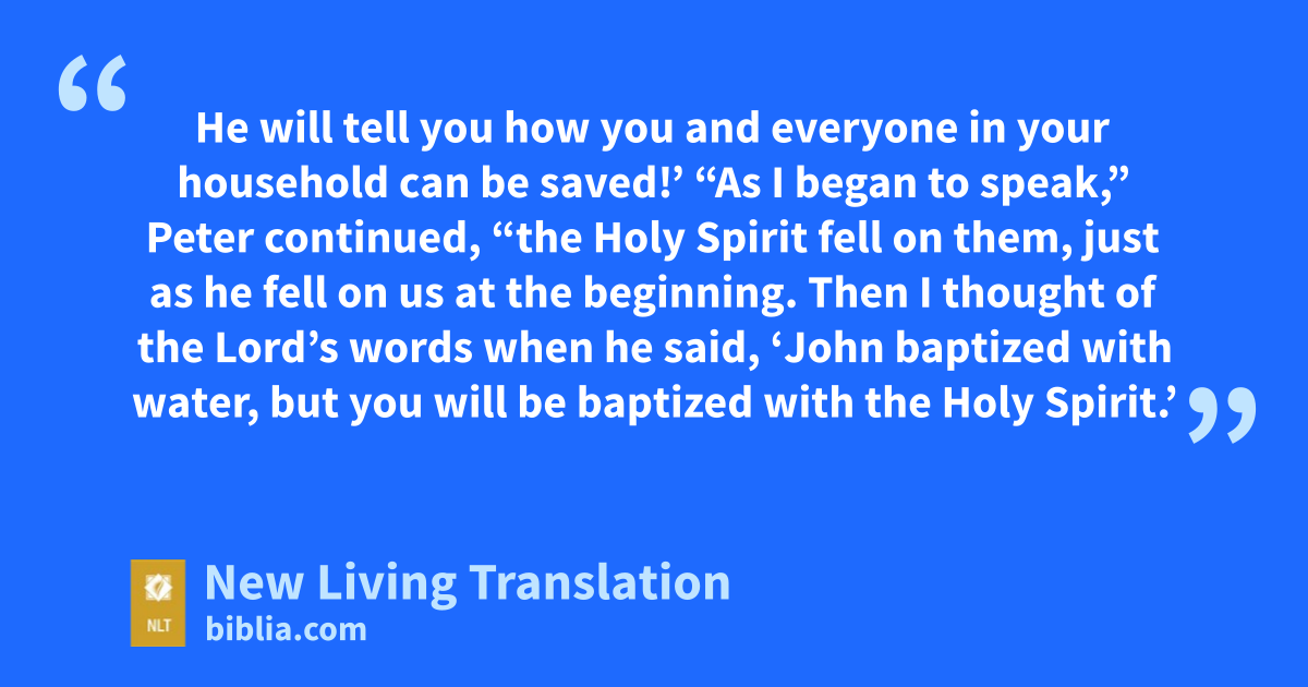 15 “As I began to speak,” Peter continued, “the Holy Spirit fell on them, just as he fell on us at the beginning. 16 Then I thought of the Lord’s words when he said, ‘John baptized with* water, but you will be baptized with the Holy Spirit.’ 17 And since God gave these Gentiles the same gift he gave us when we believed in the Lord Jesus Christ, who was I to stand in God’s way?”