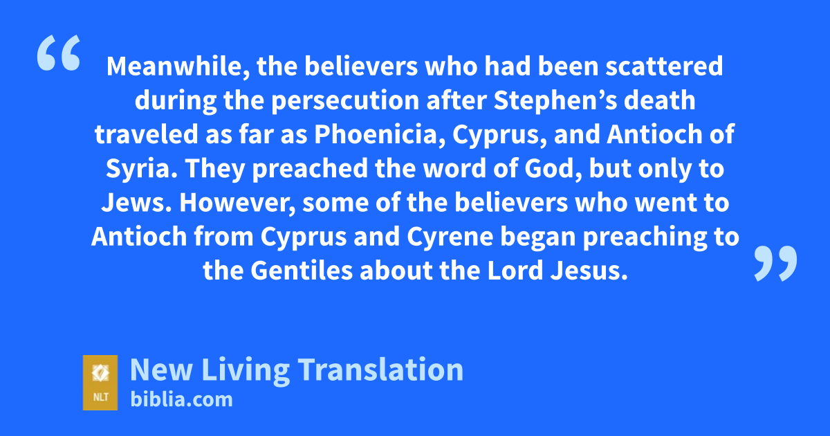 19 Meanwhile, the believers who had been scattered during the persecution after Stephen’s death traveled as far as Phoenicia, Cyprus, and Antioch of Syria. They preached the word of God, but only to Jews. 20 However, some of the believers who went to Antioch from Cyprus and Cyrene began preaching to the Gentiles* about the Lord Jesus. 21 The power of the Lord was with them, and a large number of these Gentiles believed and turned to the Lord.