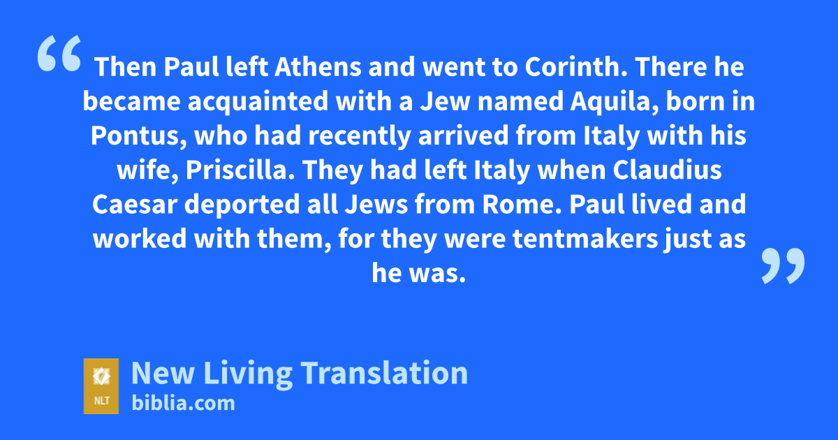 Then Paul left Athens and went to Corinth.* 2 There he became acquainted with a Jew named Aquila, born in Pontus, who had recently arrived from Italy with his wife, Priscilla. They had left Italy when Claudius Caesar deported all Jews from Rome. 3 Paul lived and worked with them, for they were tentmakers* just as he was.