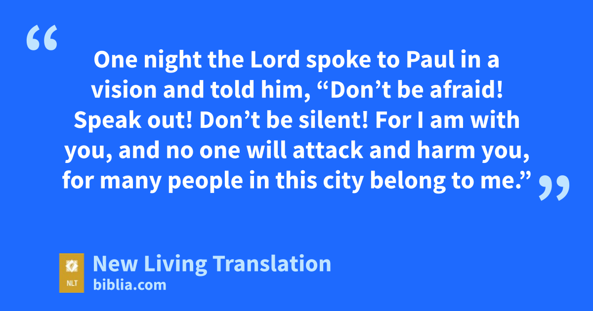9 One night the Lord spoke to Paul in a vision and told him, “Don’t be afraid! Speak out! Don’t be silent! 10 For I am with you, and no one will attack and harm you, for many people in this city belong to me.” 11 So Paul stayed there for the next year and a half, teaching the word of God.