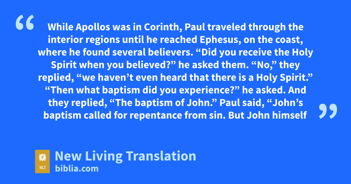 While Apollos was in Corinth, Paul traveled through the interior regions until he reached Ephesus, on the coast, where he found several believers.* 2 “Did you receive the Holy Spirit when you believed?” he asked them.