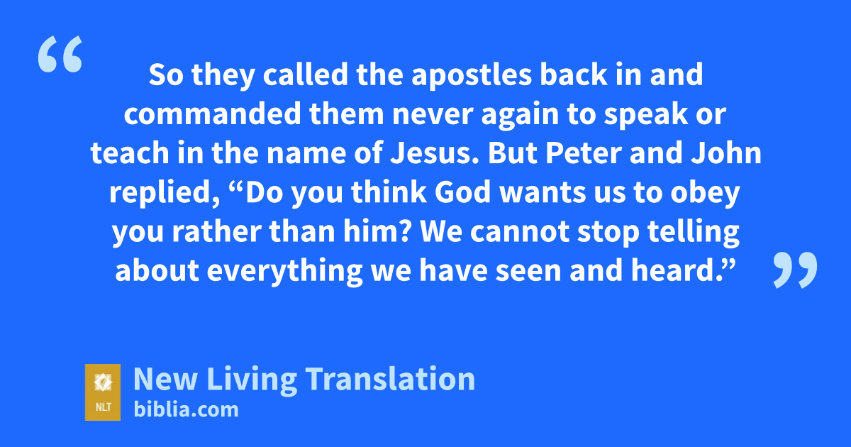 19 But Peter and John replied, “Do you think God wants us to obey you rather than him? 20 We cannot stop telling about everything we have seen and heard.”
