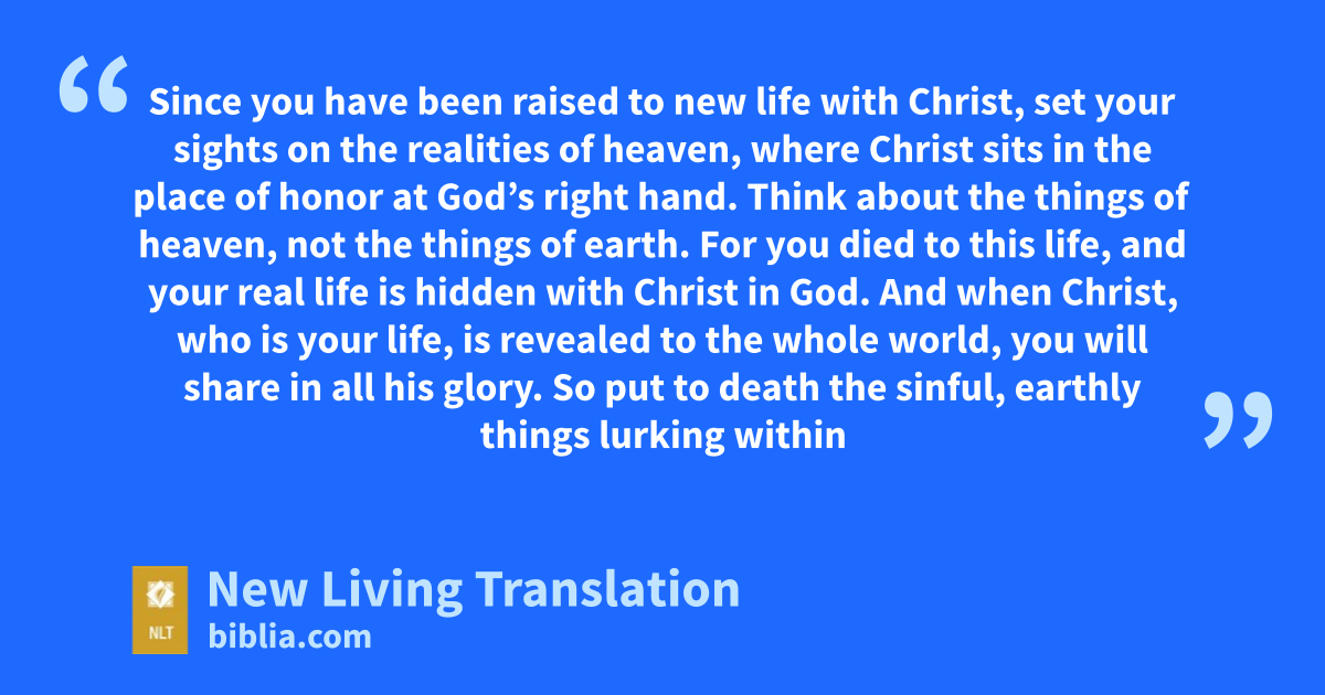 Since you have been raised to new life with Christ, set your sights on the realities of heaven, where Christ sits in the place of honor at God’s right hand. 2 Think about the things of heaven, not the things of earth. 3 For you died to this life, and your real life is hidden with Christ in God. 4 And when Christ, who is your* life, is revealed to the whole world, you will share in all his glory.