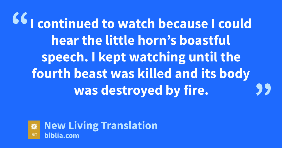 11 I continued to watch because I could hear the little horn’s boastful speech. I kept watching until the fourth beast was killed and its body was destroyed by fire. 12 The other three beasts had their authority taken from them, but they were allowed to live a while longer.*