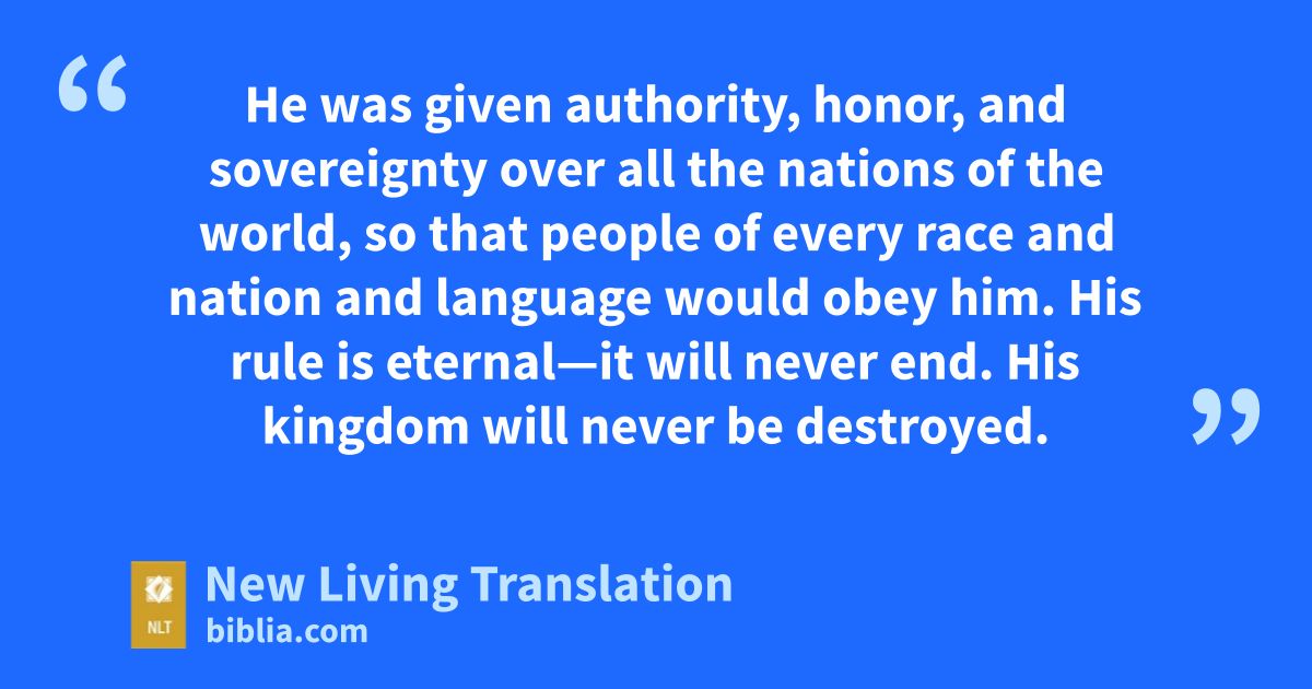 13 As my vision continued that night, I saw someone like a son of man* coming with the clouds of heaven. He approached the Ancient One and was led into his presence. 14 He was given authority, honor, and sovereignty over all the nations of the world, so that people of every race and nation and language would obey him. His rule is eternal—it will never end. His kingdom will never be destroyed.