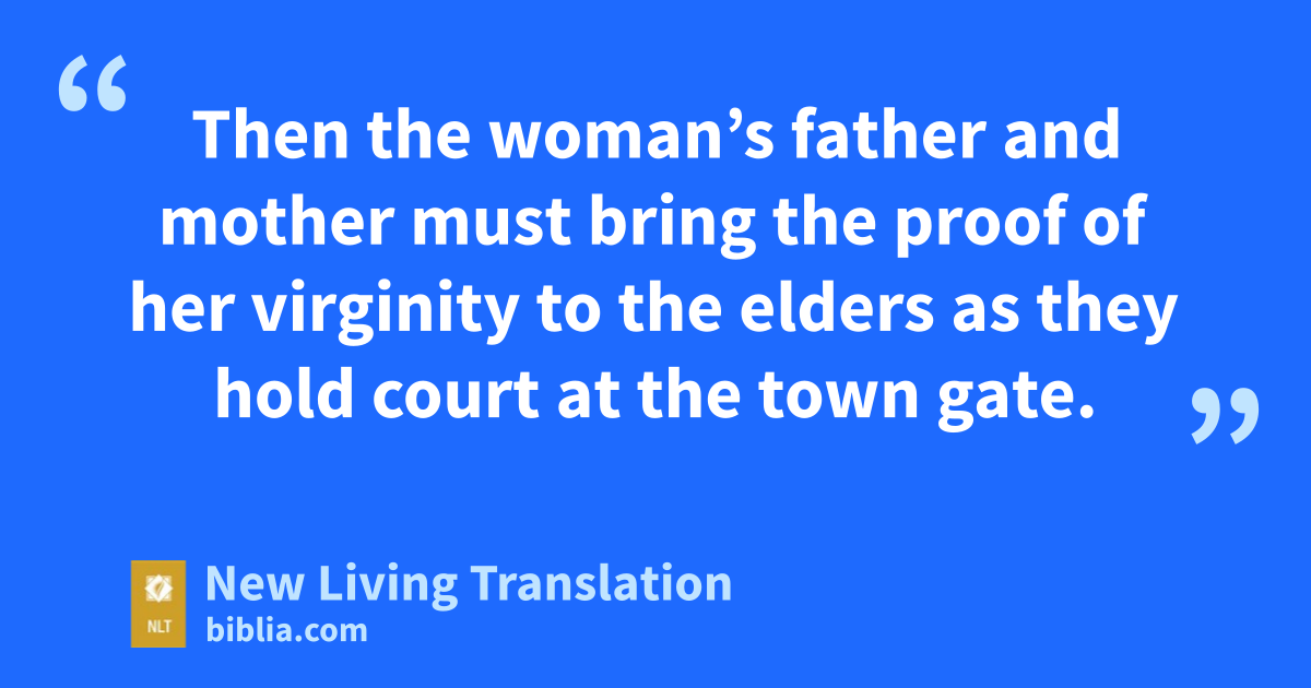13 “Suppose a man marries a woman, but after sleeping with her, he turns against her 14 and publicly accuses her of shameful conduct, saying, ‘When I married this woman, I discovered she was not a virgin.’ 15 Then the woman’s father and mother must bring the proof of her virginity to the elders as they hold court at the town gate. 16 Her father must say to them, ‘I gave my daughter to this man to be his wife, and now he has turned against her. 17 He has accused her of shameful conduct, saying, “I discovered that your daughter was not a virgin.” But here is the proof of my daughter’s virginity.’ Then they must spread her bed sheet before the elders. 18 The elders must then take the man and punish him. 19 They must also fine him 100 pieces of silver,* which he must pay to the woman’s father because he publicly accused a virgin of Israel of shameful conduct. The woman will then remain the man’s wife, and he may never divorce her.