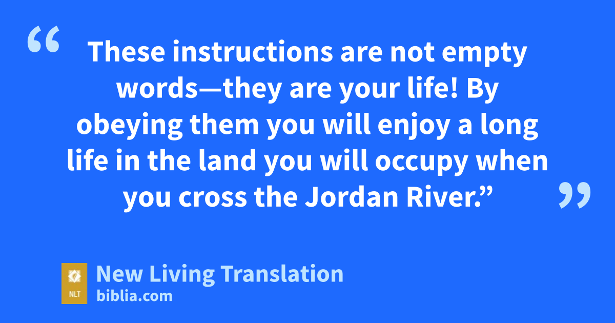 45 When Moses had finished reciting all these words to the people of Israel, 46 he added: “Take to heart all the words of warning I have given you today. Pass them on as a command to your children so they will obey every word of these instructions. 47 These instructions are not empty words—they are your life! By obeying them you will enjoy a long life in the land you will occupy when you cross the Jordan River.”
