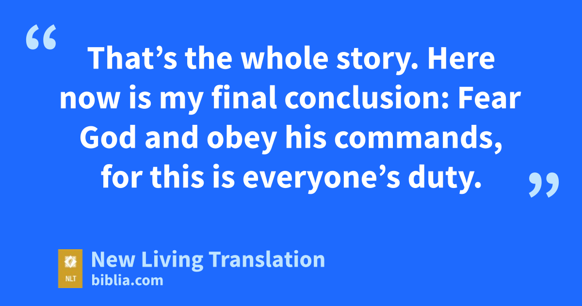 13 That’s the whole story. Here now is my final conclusion: Fear God and obey his commands, for this is everyone’s duty. 14 God will judge us for everything we do, including every secret thing, whether good or bad.