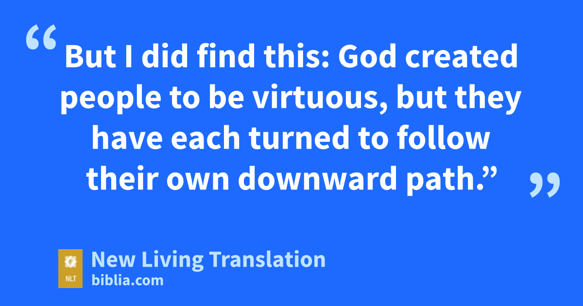 27 “This is my conclusion,” says the Teacher. “I discovered this after looking at the matter from every possible angle. 28 Though I have searched repeatedly, I have not found what I was looking for. Only one out of a thousand men is virtuous, but not one woman! 29 But I did find this: God created people to be virtuous, but they have each turned to follow their own downward path.”