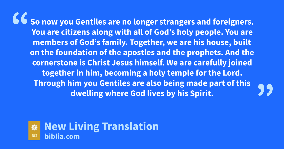 19 So now you Gentiles are no longer strangers and foreigners. You are citizens along with all of God’s holy people. You are members of God’s family. 20 Together, we are his house, built on the foundation of the apostles and the prophets. And the cornerstone is Christ Jesus himself. 21 We are carefully joined together in him, becoming a holy temple for the Lord. 22 Through him you Gentiles are also being made part of this dwelling where God lives by his Spirit.