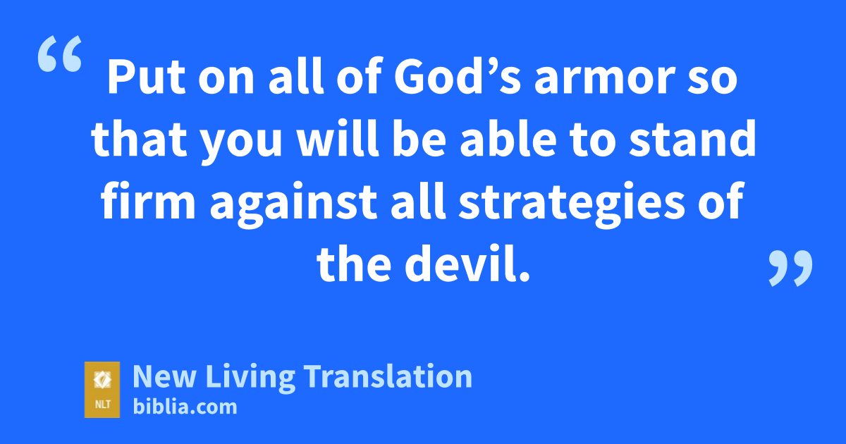 10 A final word: Be strong in the Lord and in his mighty power. 11 Put on all of God’s armor so that you will be able to stand firm against all strategies of the devil. 12 For we* are not fighting against flesh-and-blood enemies, but against evil rulers and authorities of the unseen world, against mighty powers in this dark world, and against evil spirits in the heavenly places.