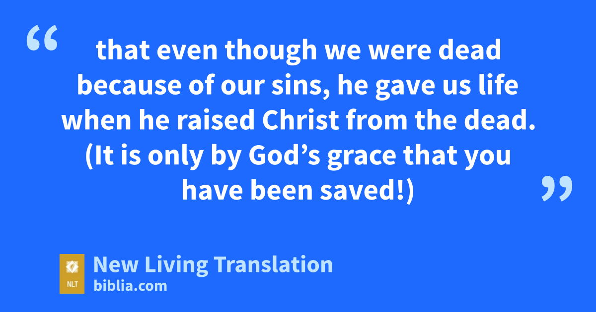 4 But God is so rich in mercy, and he loved us so much, 5 that even though we were dead because of our sins, he gave us life when he raised Christ from the dead. (It is only by God’s grace that you have been saved!) 6 For he raised us from the dead along with Christ and seated us with him in the heavenly realms because we are united with Christ Jesus. 7 So God can point to us in all future ages as examples of the incredible wealth of his grace and kindness toward us, as shown in all he has done for us who are united with Christ Jesus.