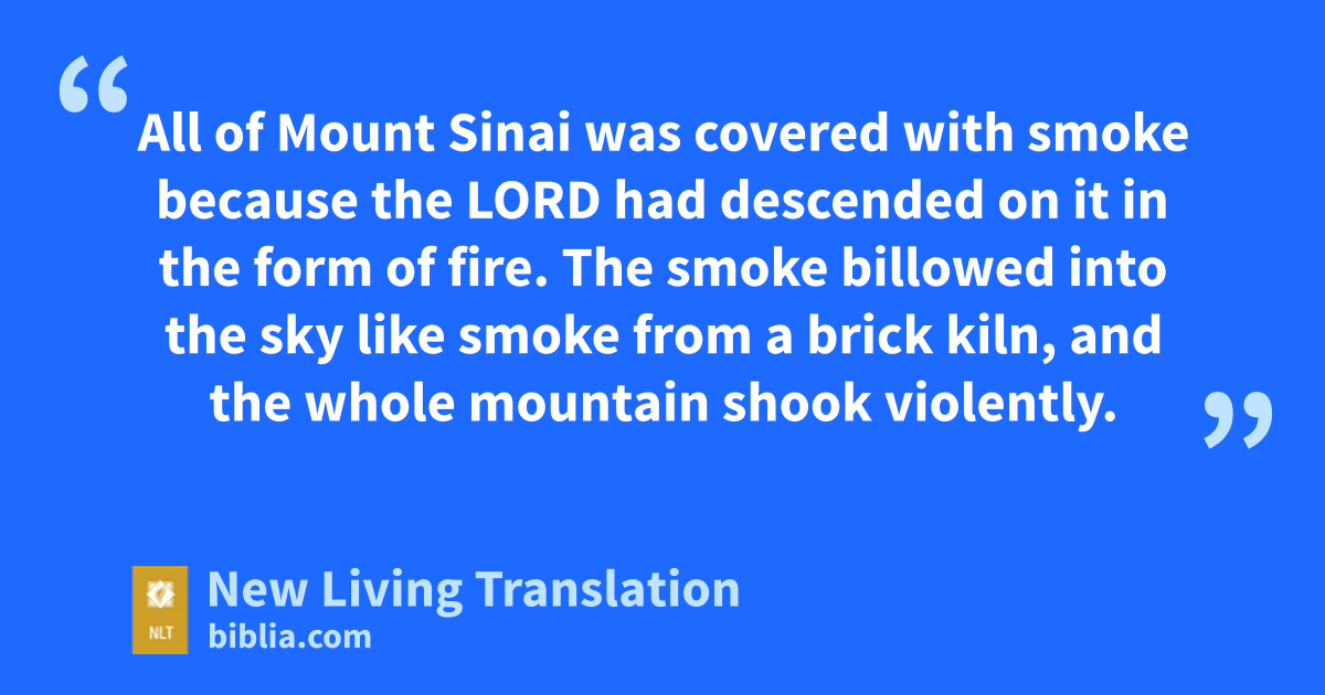 16 On the morning of the third day, thunder roared and lightning flashed, and a dense cloud came down on the mountain. There was a long, loud blast from a ram’s horn, and all the people trembled. 17 Moses led them out from the camp to meet with God, and they stood at the foot of the mountain. 18 All of Mount Sinai was covered with smoke because the Lord had descended on it in the form of fire. The smoke billowed into the sky like smoke from a brick kiln, and the whole mountain shook violently. 19 As the blast of the ram’s horn grew louder and louder, Moses spoke, and God thundered his reply. 20 The Lord came down on the top of Mount Sinai and called Moses to the top of the mountain. So Moses climbed the mountain.