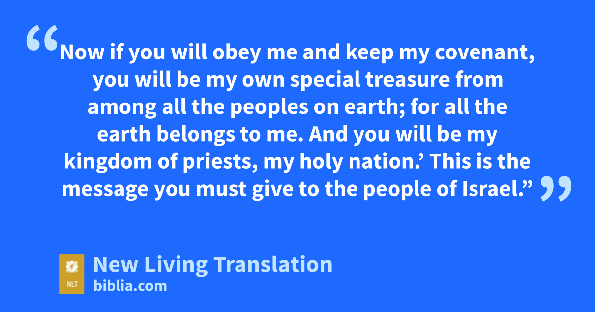 3 Then Moses climbed the mountain to appear before God. The Lord called to him from the mountain and said, “Give these instructions to the family of Jacob; announce it to the descendants of Israel: 4 ‘You have seen what I did to the Egyptians. You know how I carried you on eagles’ wings and brought you to myself. 5 Now if you will obey me and keep my covenant, you will be my own special treasure from among all the peoples on earth; for all the earth belongs to me. 6 And you will be my kingdom of priests, my holy nation.’ This is the message you must give to the people of Israel.”