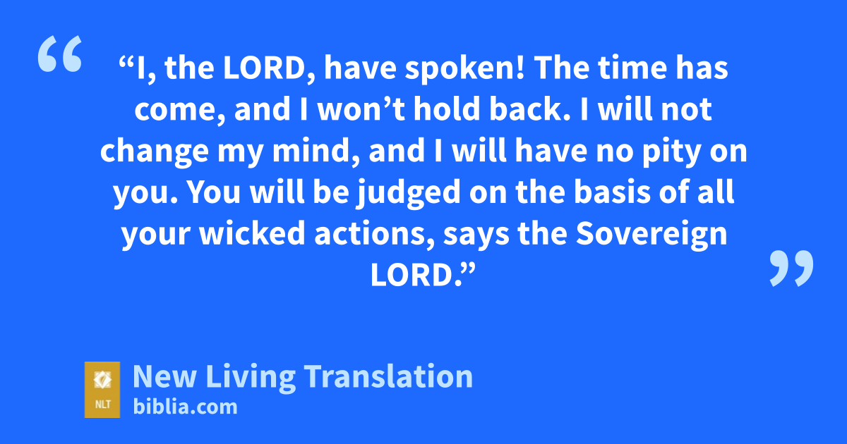 14 “I, the Lord, have spoken! The time has come, and I won’t hold back. I will not change my mind, and I will have no pity on you. You will be judged on the basis of all your wicked actions, says the Sovereign Lord.”