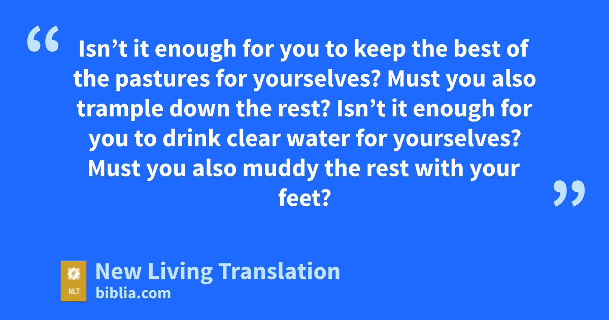 17 “And as for you, my flock, this is what the Sovereign Lord says to his people: I will judge between one animal of the flock and another, separating the sheep from the goats. 18 Isn’t it enough for you to keep the best of the pastures for yourselves? Must you also trample down the rest? Isn’t it enough for you to drink clear water for yourselves? Must you also muddy the rest with your feet? 19 Why must my flock eat what you have trampled down and drink water you have fouled?