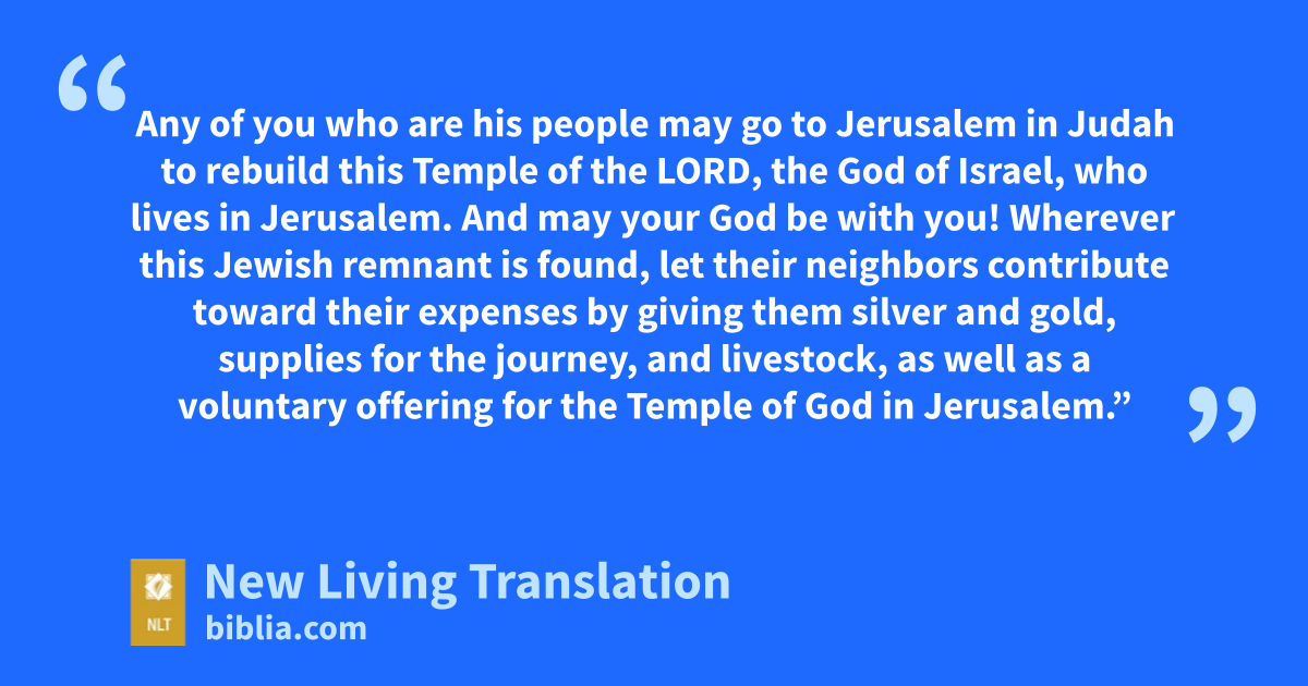 “The Lord, the God of heaven, has given me all the kingdoms of the earth. He has appointed me to build him a Temple at Jerusalem, which is in Judah. 3 Any of you who are his people may go to Jerusalem in Judah to rebuild this Temple of the Lord, the God of Israel, who lives in Jerusalem. And may your God be with you! 4 Wherever this Jewish remnant is found, let their neighbors contribute toward their expenses by giving them silver and gold, supplies for the journey, and livestock, as well as a voluntary offering for the Temple of God in Jerusalem.”