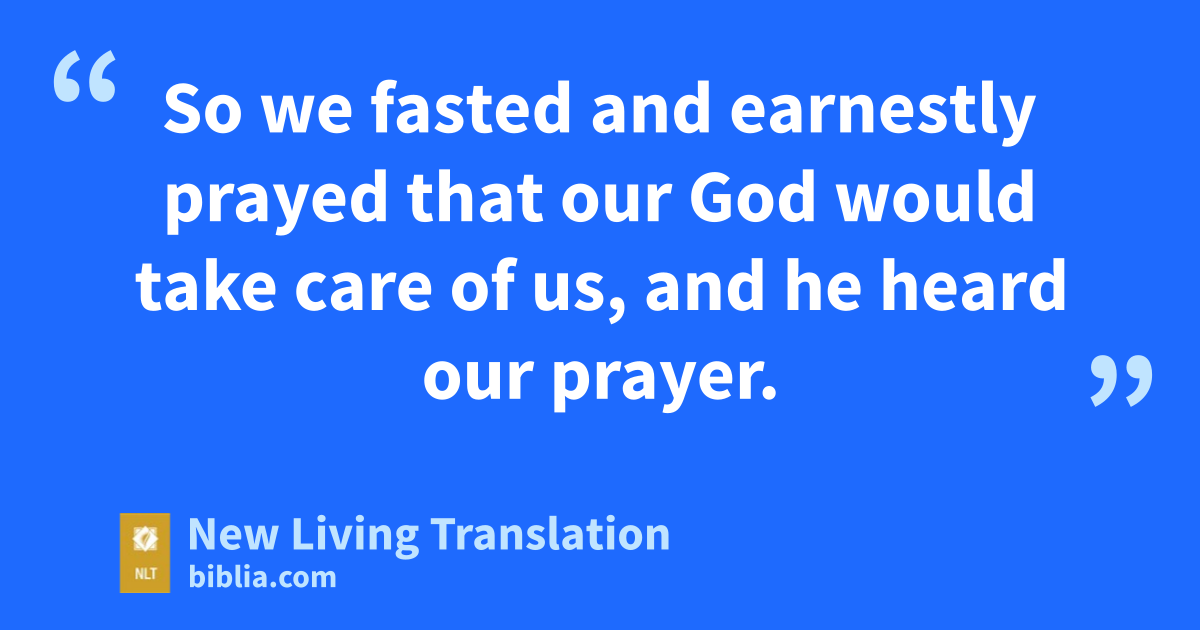 21 And there by the Ahava Canal, I gave orders for all of us to fast and humble ourselves before our God. We prayed that he would give us a safe journey and protect us, our children, and our goods as we traveled. 22 For I was ashamed to ask the king for soldiers and horsemen* to accompany us and protect us from enemies along the way. After all, we had told the king, “Our God’s hand of protection is on all who worship him, but his fierce anger rages against those who abandon him.” 23 So we fasted and earnestly prayed that our God would take care of us, and he heard our prayer.