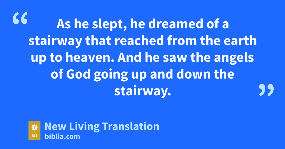 10 Meanwhile, Jacob left Beersheba and traveled toward Haran. 11 At sundown he arrived at a good place to set up camp and stopped there for the night. Jacob found a stone to rest his head against and lay down to sleep. 12 As he slept, he dreamed of a stairway that reached from the earth up to heaven. And he saw the angels of God going up and down the stairway.