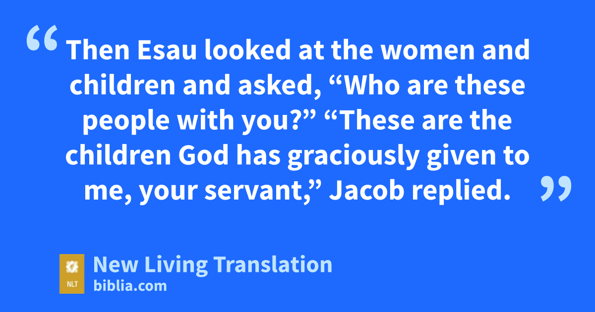 10 But Jacob insisted, “No, if I have found favor with you, please accept this gift from me. And what a relief to see your friendly smile. It is like seeing the face of God! 11 Please take this gift I have brought you, for God has been very gracious to me. I have more than enough.” And because Jacob insisted, Esau finally accepted the gift.