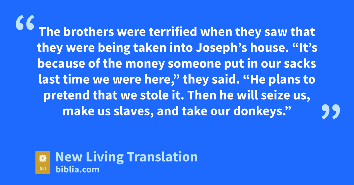 18 The brothers were terrified when they saw that they were being taken into Joseph’s house. “It’s because of the money someone put in our sacks last time we were here,” they said. “He plans to pretend that we stole it. Then he will seize us, make us slaves, and take our donkeys.”