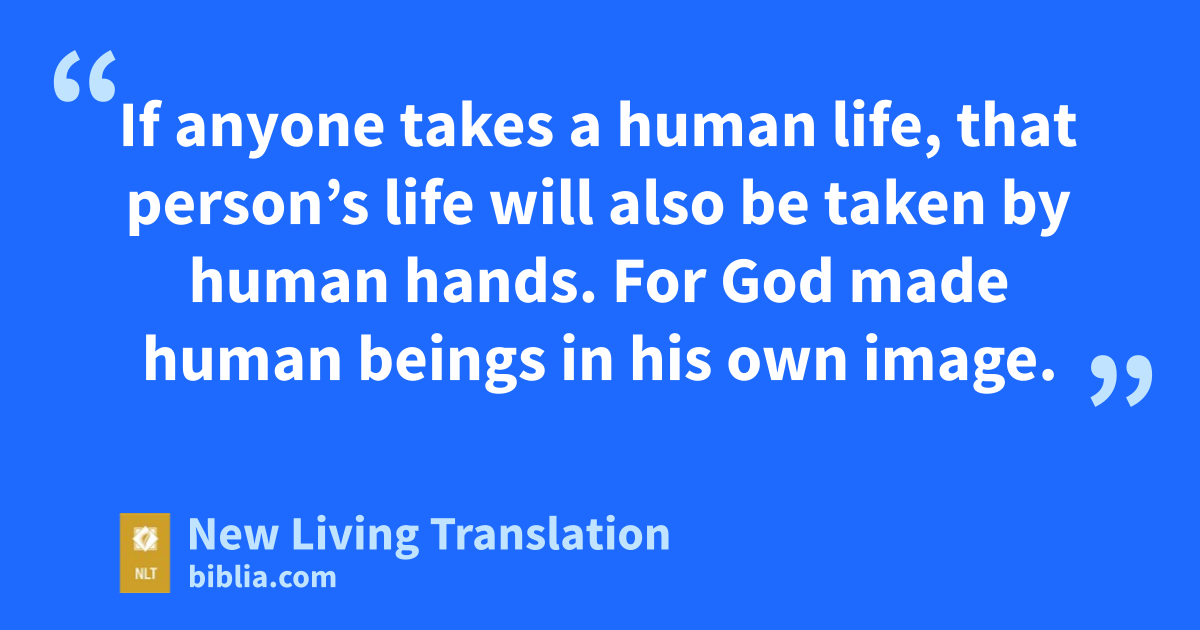 5 “And I will require the blood of anyone who takes another person’s life. If a wild animal kills a person, it must die. And anyone who murders a fellow human must die. 6 If anyone takes a human life, that person’s life will also be taken by human hands. For God made human beings* in his own image. 7 Now be fruitful and multiply, and repopulate the earth.”