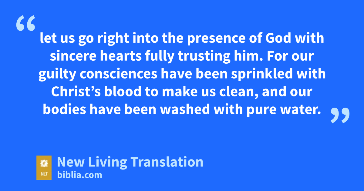 19 And so, dear brothers and sisters,* we can boldly enter heaven’s Most Holy Place because of the blood of Jesus. 20 By his death,* Jesus opened a new and life-giving way through the curtain into the Most Holy Place. 21 And since we have a great High Priest who rules over God’s house, 22 let us go right into the presence of God with sincere hearts fully trusting him. For our guilty consciences have been sprinkled with Christ’s blood to make us clean, and our bodies have been washed with pure water.