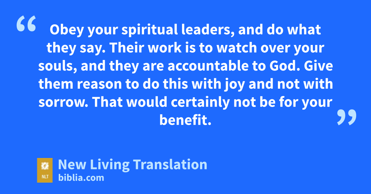17 Obey your spiritual leaders, and do what they say. Their work is to watch over your souls, and they are accountable to God. Give them reason to do this with joy and not with sorrow. That would certainly not be for your benefit.