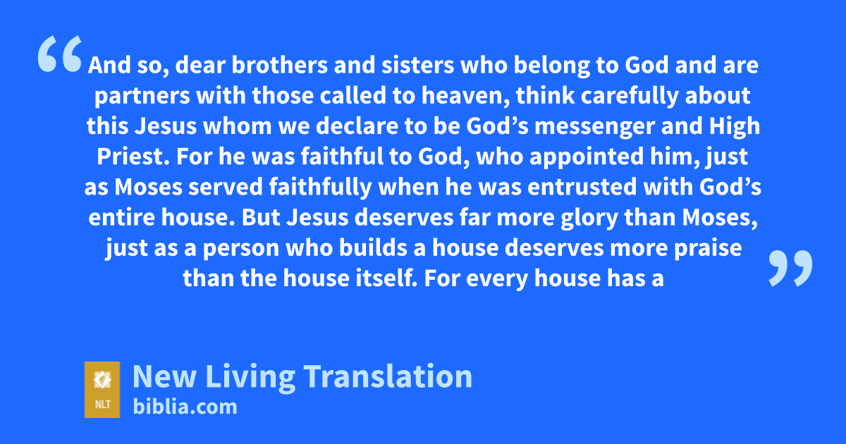 And so, dear brothers and sisters who belong to God and* are partners with those called to heaven, think carefully about this Jesus whom we declare to be God’s messenger* and High Priest. 2 For he was faithful to God, who appointed him, just as Moses served faithfully when he was entrusted with God’s entire* house.
