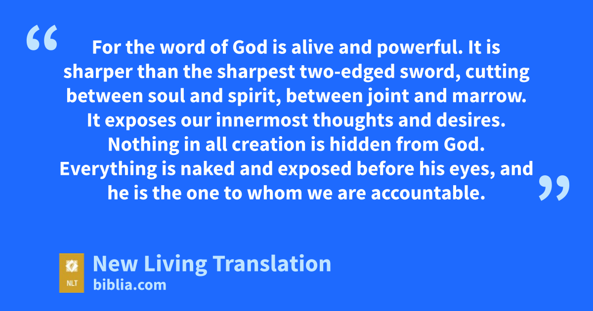 12 For the word of God is alive and powerful. It is sharper than the sharpest two-edged sword, cutting between soul and spirit, between joint and marrow. It exposes our innermost thoughts and desires. 13 Nothing in all creation is hidden from God. Everything is naked and exposed before his eyes, and he is the one to whom we are accountable.