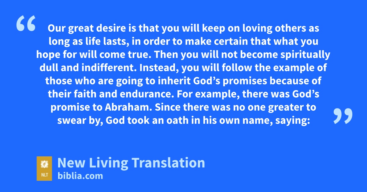 9 Dear friends, even though we are talking this way, we really don’t believe it applies to you. We are confident that you are meant for better things, things that come with salvation. 10 For God is not unjust. He will not forget how hard you have worked for him and how you have shown your love to him by caring for other believers,* as you still do. 11 Our great desire is that you will keep on loving others as long as life lasts, in order to make certain that what you hope for will come true. 12 Then you will not become spiritually dull and indifferent. Instead, you will follow the example of those who are going to inherit God’s promises because of their faith and endurance.