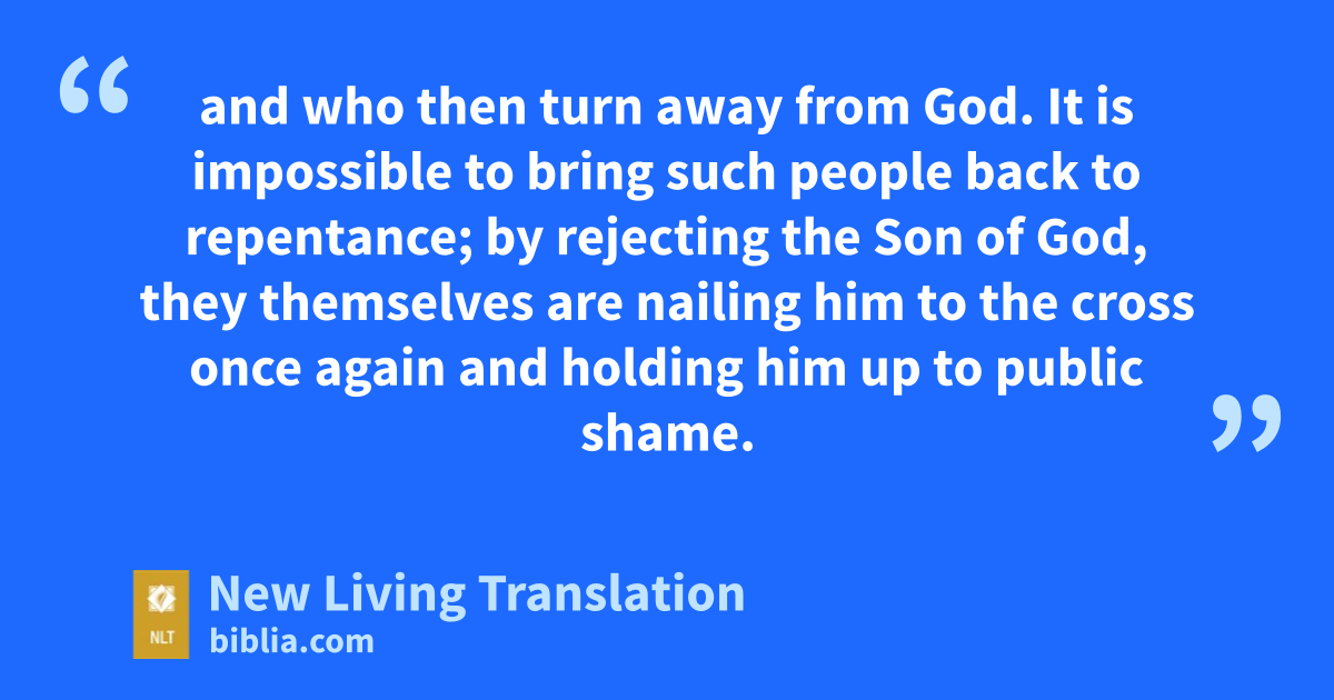 4 For it is impossible to bring back to repentance those who were once enlightened—those who have experienced the good things of heaven and shared in the Holy Spirit, 5 who have tasted the goodness of the word of God and the power of the age to come—6 and who then turn away from God. It is impossible to bring such people back to repentance; by rejecting the Son of God, they themselves are nailing him to the cross once again and holding him up to public shame.
